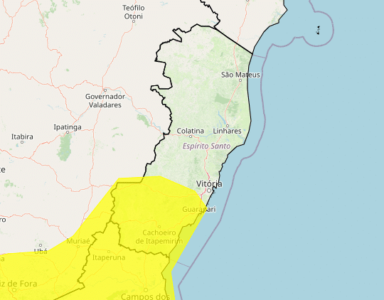O aviso abrange 37 dos 78 municípios capixabas. Segundo o Inmet, a chuva pode variar entre 20 e 30 mm/h, com acumulados que podem alcançar até 50 mm ao longo do dia. Já os ventos poderão atingir velocidades entre 40 e 60 km/h.