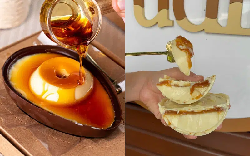 Entre as apostas está a Alê do Pudim, no Shopping Mestre Álvaro, que trouxe uma proposta inspirada em uma sobremesa clássica. O principal destaque é o Ovo Pudim, preparado com meia casca de chocolate ao leite, recheio de pudim de leite condensado, cobertura de caramelo e finalização com mini pudim. O produto é vendido por R$ 95.