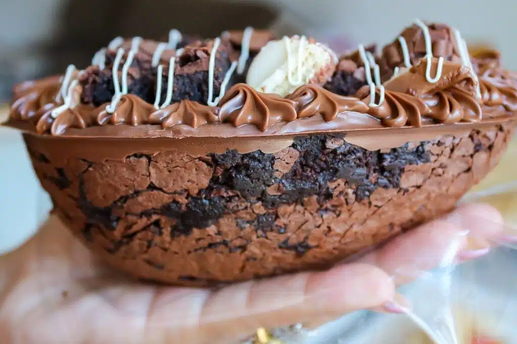 Outra opção é o ovo com casca de brownie, recheado com brigadeiro de Ninho e chocolate meio amargo, finalizado com pedaços de brownie e Nutella, vendido por R$ 145. Encomendas pelo Instagram ou whatsapp (27) 98846-5268
