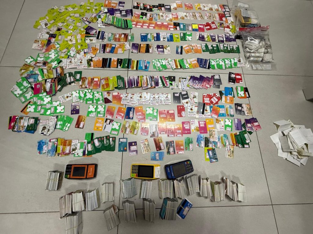 Os dois suspeitos, um homem e uma mulher, ambos de 43 anos, foram detidos em flagrante em um condomínio de luxo na Serra. No local, os policiais apreenderam quase dois mil cartões de benefícios em nome de terceiros, além de celulares, máquinas de cartão registradas em CNPJs de “laranjas”, cheques, notas promissórias, documentos contábeis e um veículo de luxo.