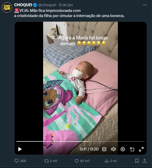 E para quem estava preocupado com o estado de saúde da ‘paciente', a Maria Eduarda esclareceu que está tudo bem. “A boneca está se recuperando. Ela estava andando de bicicleta ‘paw' foi com a cabeça na pedra. Ela não está aqui comigo, mas eu vou dando notícias pra vocês”, finalizou.