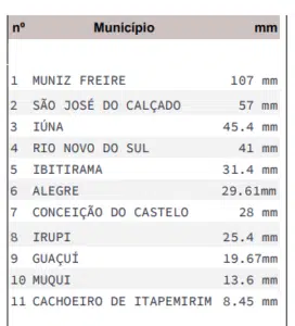 Segundo o Boletim, o coordenador da Defesa Civil de Mimoso do Sul informou que foram registrados acumulados de aproximadamente 100 mm de chuva nos distritos de Santa Cruz, São José das Torres e Santa Rosa; todos medidos por pluviômetros convencionais. Até o momento, não foram