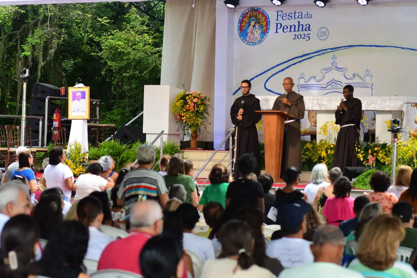 “A Festa da Penha 2025 lamenta com profunda tristeza o falecimento de nosso Santo Padre, o Papa Francisco. O tema da festa deste ano, “Com Maria, peregrinos de esperança” é inspirado no Jubileu anunciado pelo próprio Papa. Francisco, ao anunciá-lo, disse que “cada um de nós precisa de esperança: as nossas vidas, às vezes cansadas e feridas, os nossos corações sedentos de verdade, bondade e beleza, os nossos sonhos que nenhuma escuridão pode extinguir. Tudo, dentro e fora de nós, invoca esperança e vai procurando, mesmo sem o saber, a proximidade a Deus”. E assim faremos nesses dias de devoção à Mãe das Alegrias: espalhar a mensagem de que a esperança preencha os nossos dias e homenagear este Santo Padre, que seguiu os passos de Francisco de Assis em todo o seu pontificado. Ele sempre será exemplo de amor, de união, compaixão, respeito e olhar fraterno.
