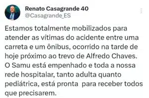 O acidente mobilizou também o governador Renato Casagrande, que se pronunciou nas redes sociais: “Estamos mobilizados para prestar todo o atendimento necessário. O Samu está no local e nossa rede hospitalar, tanto adulta quanto pediátrica, está pronta para receber os feridos.”