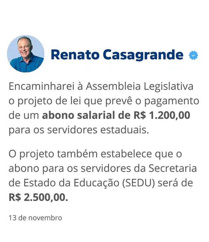 O governador do Espírito Santo, Renato Casagrande, anunciou nesta quinta-feira (13), o envio de um projeto de lei à Assembleia Legislativa que prevê o pagamento de um abono salarial aos servidores públicos estaduais.
