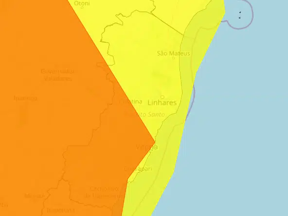 O alerta de perigo potencial, de menor intensidade, abrange todos os municípios capixabas. De acordo com o Inmet, há previsão de chuva entre 20 e 30 milímetros por hora ou até 50 milímetros por dia, além de ventos que podem chegar a 60 km/h.