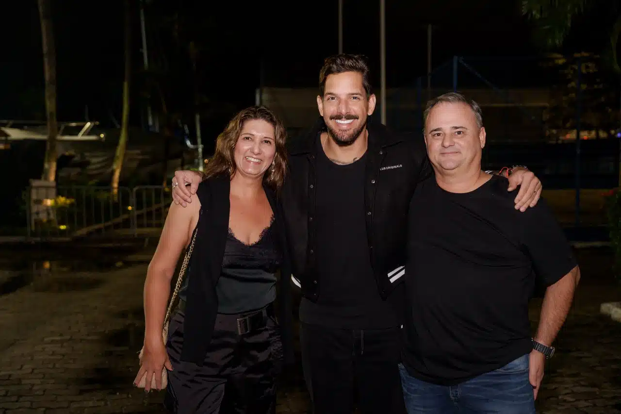 Alegria contagiante e clima vibrante marcaram a noite de axé no Iate Clube. Na foto, Consuelo Fidelis, o cantor da Banda Eva, Felipe Pezzoni, e Leonardo Ceolin celebram com muito estilo. Crédito:Camilla Baptistin.