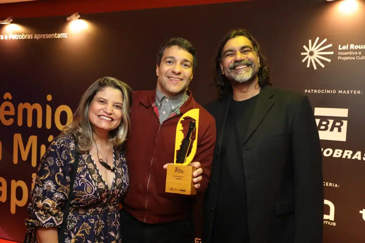 Rodrigo Lima, vocalista da banda Dead Fish, vencedora do Prêmio da Música Capixaba na categoria Melhor Grupo ou Banda de 2024, entre os correalizadores do prêmio, Daniel Morelo e Simone Marçal, no tapete vermelho da 4ª edição da premiação, realizada nesta terça-feira, no Teatro da Ufes. Foto: Cláudio Postay.