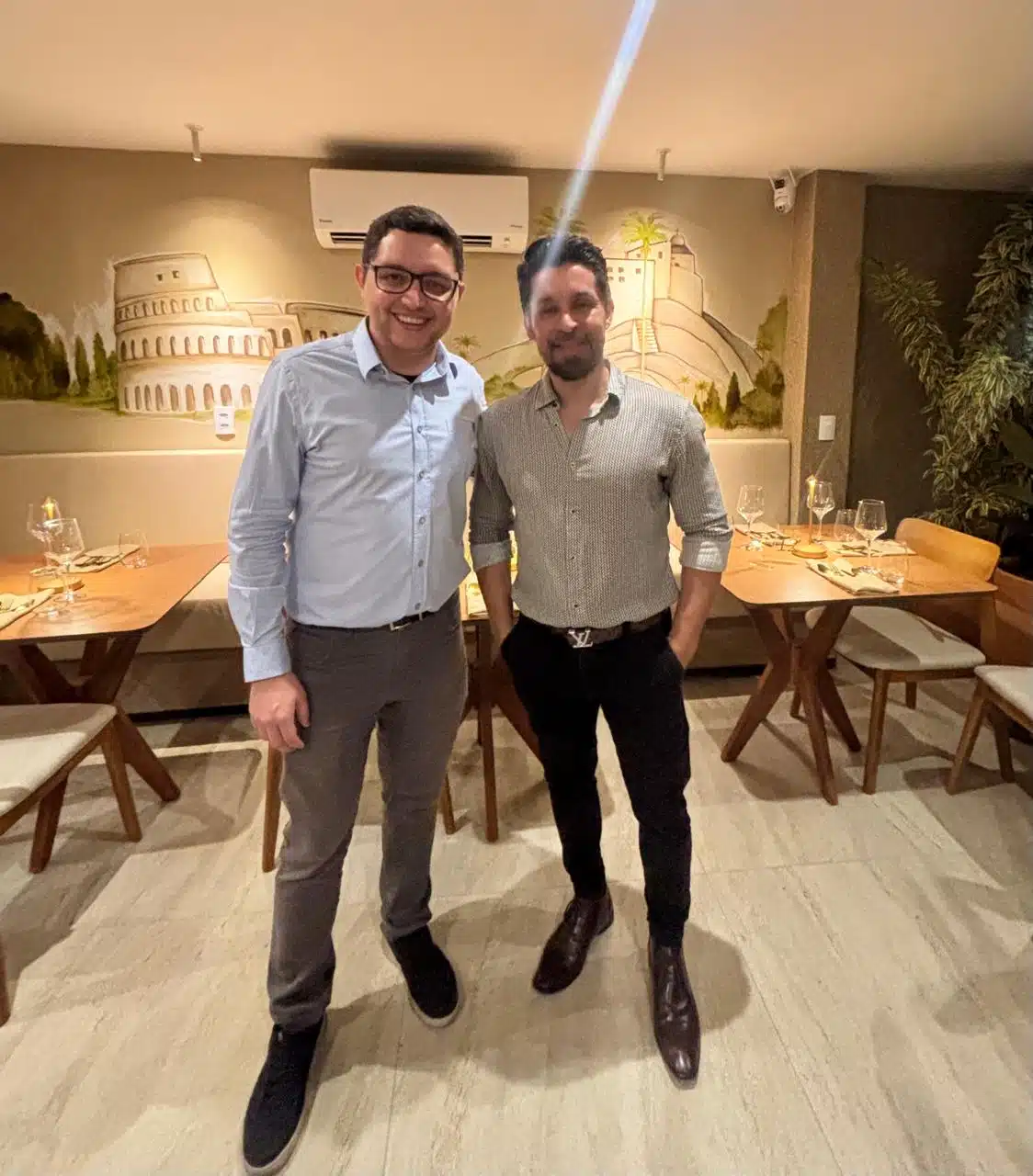 Ontem, Vila Velha ganhou um novo espaço de charme e sofisticação com a inauguração do Stefano Cucina Italiana & Cafetteria, na Prainha. O restaurante traz o melhor da alta gastronomia 100% italiana, em um ambiente acolhedor e com vista deslumbrante para o Santuário do Convento da Penha. Na foto, o Frei Gabriel Dellandrea, guardião do Convento da Penha, ao lado do artista plástico Rodrigo Dutra, responsável pelas artes murais que dão vida ao espaço. O registro foi feito em frente ao painel artístico que retrata o Convento da Penha, obra criada especialmente para o restaurante, reforçando a conexão entre cultura, espiritualidade e arte que marca o novo empreendimento. Crédito:CL.