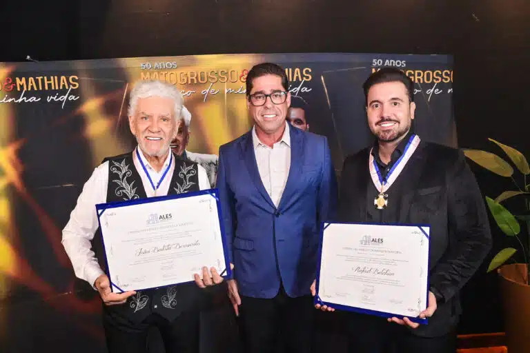 Uma noite para guardar na memória e no coração. Vitória recebeu, pela primeira vez, a dupla Matogrosso & Mathias no Espaço Patrick Ribeiro, que estava completamente lotado e vibrante. A turnê “Pedaço de Minha Vida”, que celebra 50 anos de uma trajetória de ouro, trouxe um repertório repleto de clássicos, como “Tentei Te Esquecer” e “Na Hora do Adeus”, cantados em coro por gerações de fãs. O show ganhou um tom ainda mais especial com o reconhecimento oficial ao legado dos artistas: a entrega do título de cidadão espírito-santense e da comenda Ordem do Mérito Domingos Martins, concedidos pessoalmente pelo deputado estadual e presidente da Assembleia Legislativa do ES, Marcelo Santos. Muito além de uma apresentação, foi o encontro afetivo de um público apaixonado com vozes que fazem parte da história da música brasileira. Confira os registros desse momento!Fotos:Cloves Louzada.