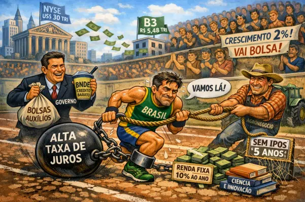 Na arquibancada da corrida, palmas para o rame-rame da economia de 2% de crescimento. Palmas para o crescimento da Bolsa que se movimenta com alguns caraminguás saídos da Bolsa de NY. Atualmente, o valor de mercado das empresas listadas na Bolsa de Nova York (NYSE) gira em torno de US$30 trilhões, enquanto na B3 (Brasil) o valor agregado das companhias é de aproximadamente R$5,48 trilhões (cerca de US$1,1 trilhão).