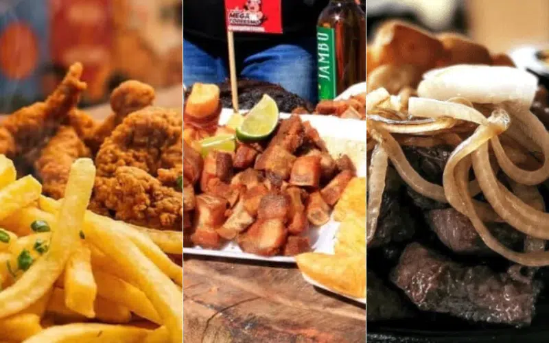 O torresmo aparece em diferentes versões, como pururuca, de rolo e o tradicional de boteco. No entanto, o cardápio vai além. Mais de 25 expositores oferecem pratos como costela fogo de chão, baião de dois, feijão tropeiro, hambúrgueres e batatas recheadas.