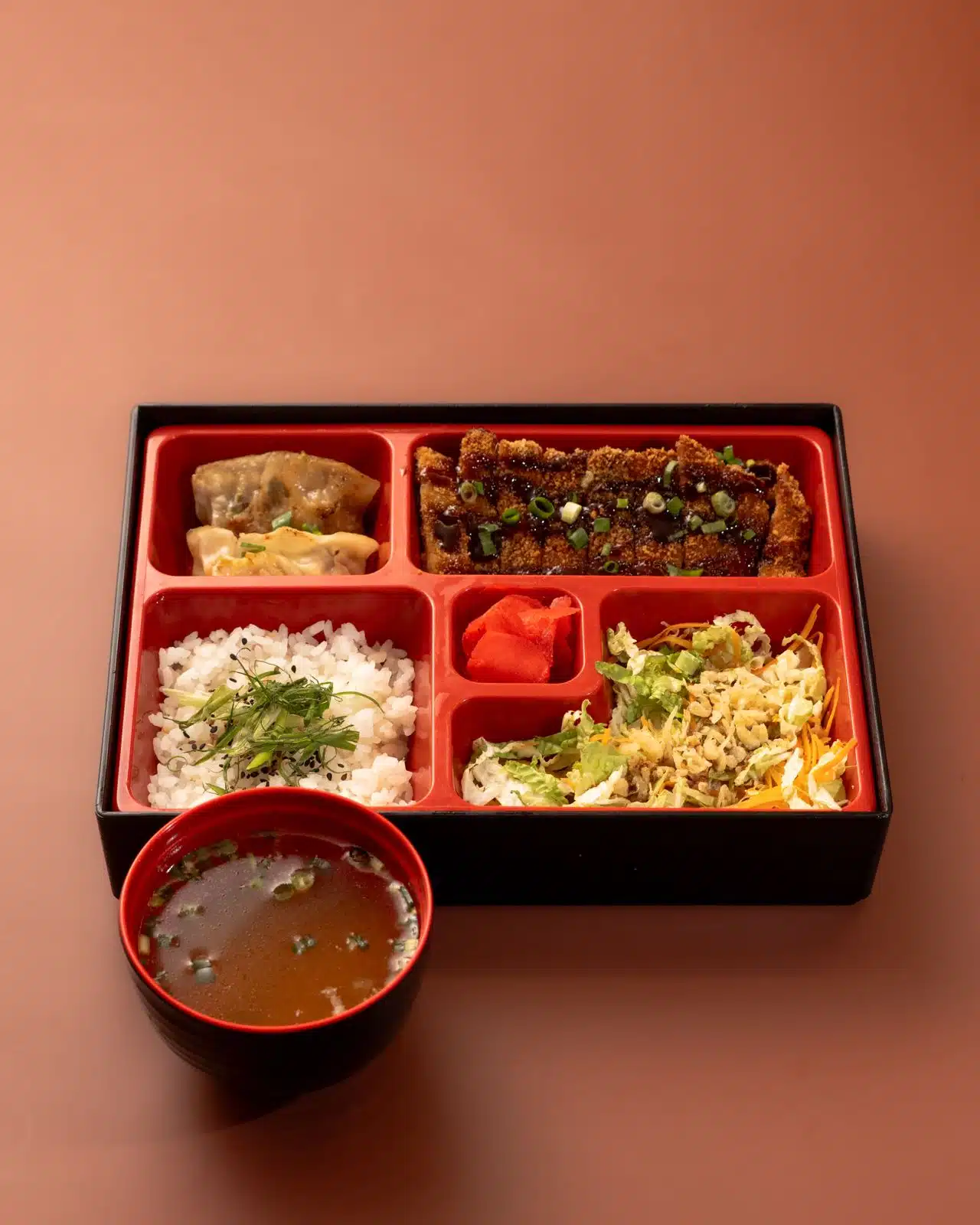 Lombo suíno empanado na panko com molho tarê, duas gyozas suínas, gohan, salada fresca e gengibre. Acompanha sopa de missô.