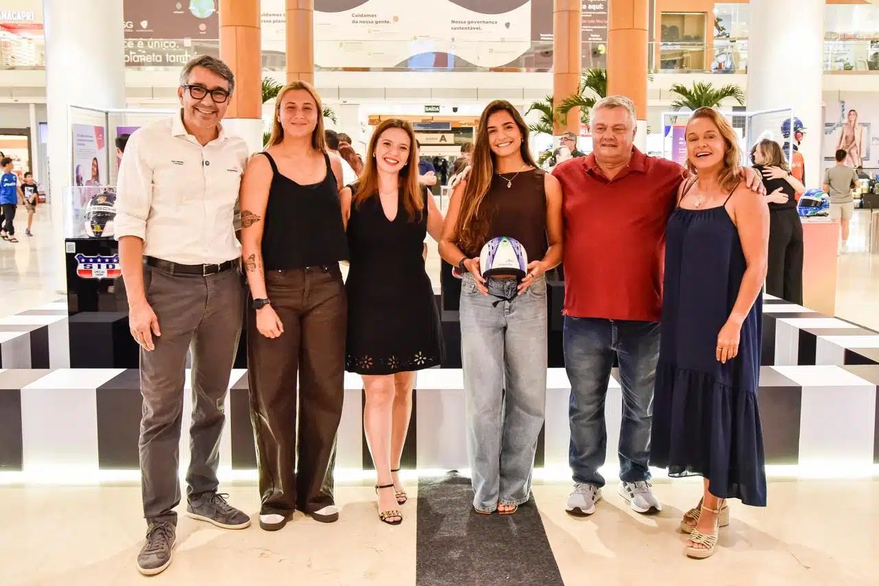 O Shopping Vitória recebeu convidados, na quinta-feira (12), para a abertura da mostra “As Cores da Velocidade”, realizada pela ArcelorMittal. A exposição reúne capacetes icônicos de lendas como Ayrton Senna e Emerson Fittipaldi. Na foto, o diretor de Sustentabilidade e Relações Institucionais da ArcelorMittal Aços Planos América Latina, João Bosco Reis da Silva; a atleta bodyboarder capixaba que fez bonito no Hawaii, Bianca Simões; Stella Mosca, sócia-diretora da Sid Special Paint, renomada empresa brasileira de personalização de capacetes de automobilismo; Luna Hardman, campeã do Hawai‘i Pipeline Bodyboarding Championship 2026; Alan Mosca, filho do lendário Sid Mosca, que mantém viva a tradição na pintura de capacetes dos maiores ídolos do automobilismo e nossa sempre campeã, Neymara Carvalho, que chegaram de viagem internacional direto para prestigiar o evento. As peças históricas estão na Ala Parque (1º piso), com visitação gratuita e segue disponível para o público até a próxima quarta-feira, dia 18 de março. Crédito das fotos: Mosaico Imagem