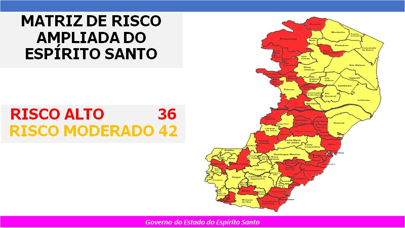 O governador do Estado, Renato Casagrande, liderou, nesta sexta-feira (05), mais uma reunião da Sala de Situação de Emergência em Saúde Pública, por meio de videoconferência. Foi apresentado o novo Mapa de Risco, que terá vigência entre a próxima segunda-feira (08) até o domingo (14). Com o aumento na taxa de ocupação de leitos de UTI destinados ao tratamento de casos do novo Coronavírus (Covid-19), 36 municípios fazem parte do grupo de Risco Alto e outros 42 em Risco Moderado. Não há municípios capixabas classificados como Risco Baixo. A portaria será publicada neste final de semana.