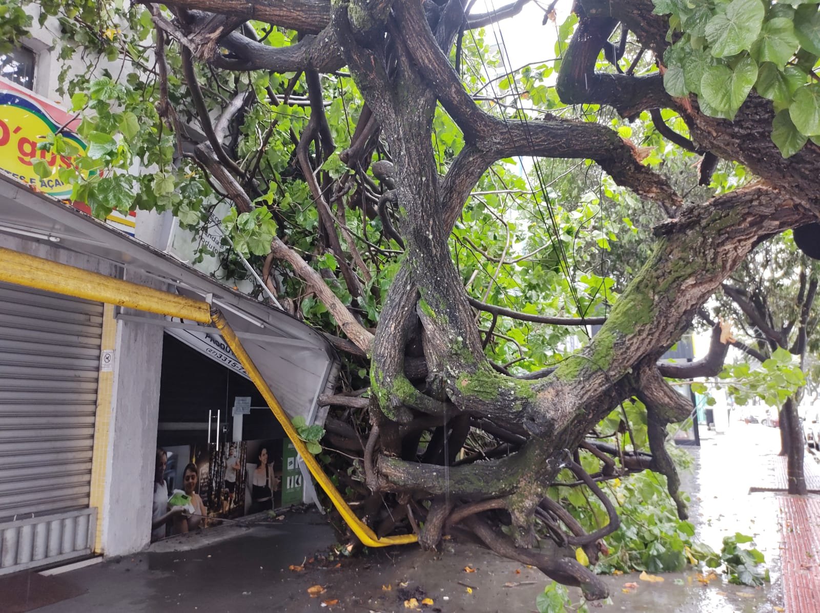 Ninguém foi atingido pelo destroços da árvore, mas o telhado atingido deixou um prejuízo para o proprietário do local.