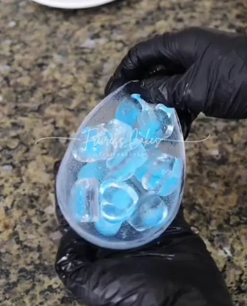 Na gravação, a criadora de conteúdo testa a ideia utilizando uma forma de três partes, semelhante às usadas na produção de ovos de chocolate. A água é adicionada até a marcação indicada, mas, em uma das tentativas, o excesso provoca transbordamento e compromete o resultado final.