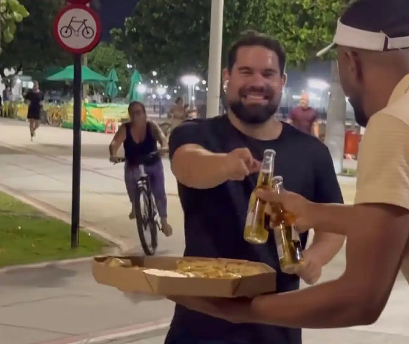 Já no período da noite, o influenciador retornou ao local e repetiu a provocação, desta vez com uma combinação ainda mais tentadora: pizza e cerveja para quem caminhava pelo calçadão.