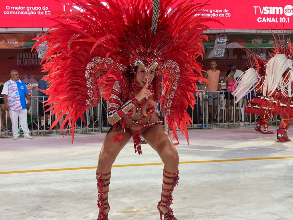 A segunda escola a desfilar no Sambão do Povo nesta sexta-feira (6) foi a Novo Império, agremiação da Grande Santo Antônio, em Vitória. Com o enredo “Aruanayê – Guardiãs dos Mistérios Ancestrais”, a escola levou à avenida uma narrativa simbólica que celebra a conexão entre xamãs africanas e guerreiras indígenas, retratadas como guardiãs do saber ancestral.