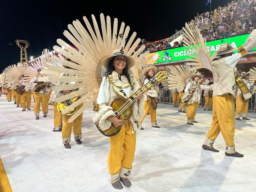 Ao todo, 1.900 componentes desfilaram distribuídos em 23 alas. A escola apresentou três carros alegóricos e um tripé, com elementos como cavaquinhos, discos musicais e sinos de matriz que enriqueceram o visual da avenida. Alas em tons de azul e verde, com adornos de barquinhos de papel, completaram o colorido do desfile.