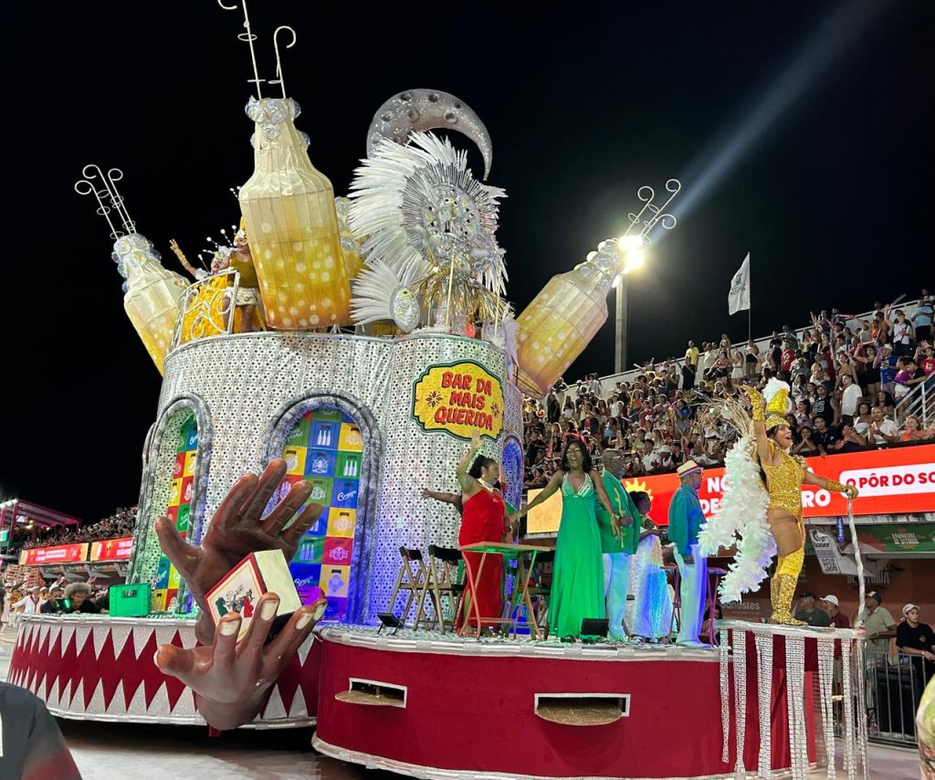 A segunda alegoria, intitulada “Bar da Mais Querida”, apostou em garrafas de cerveja e um clima simpático, colorido e boêmio.