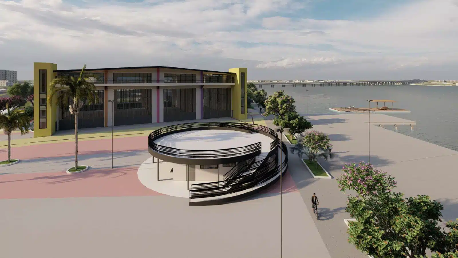 A área terá também um espaço de apoio administrativo com refeitório e banheiros coletivos, além de áreas de lazer como pet park e parque infantil. O projeto contempla ainda estacionamento e intervenções na Orla do Tancredão, com arquibancada alagável e deck para atracação, integrando o complexo ao entorno urbano.