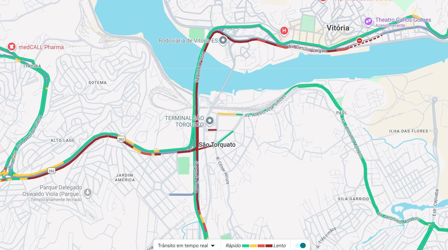 Em razão das interdições, o trânsito deu um verdadeiro nó nos acessos à capital e está complicado na região metropolitana, com reflexos no Centro de Vitória, na Segunda Ponte e até mesmo em Alto Lage em Cariacica. Veja no mapa:
