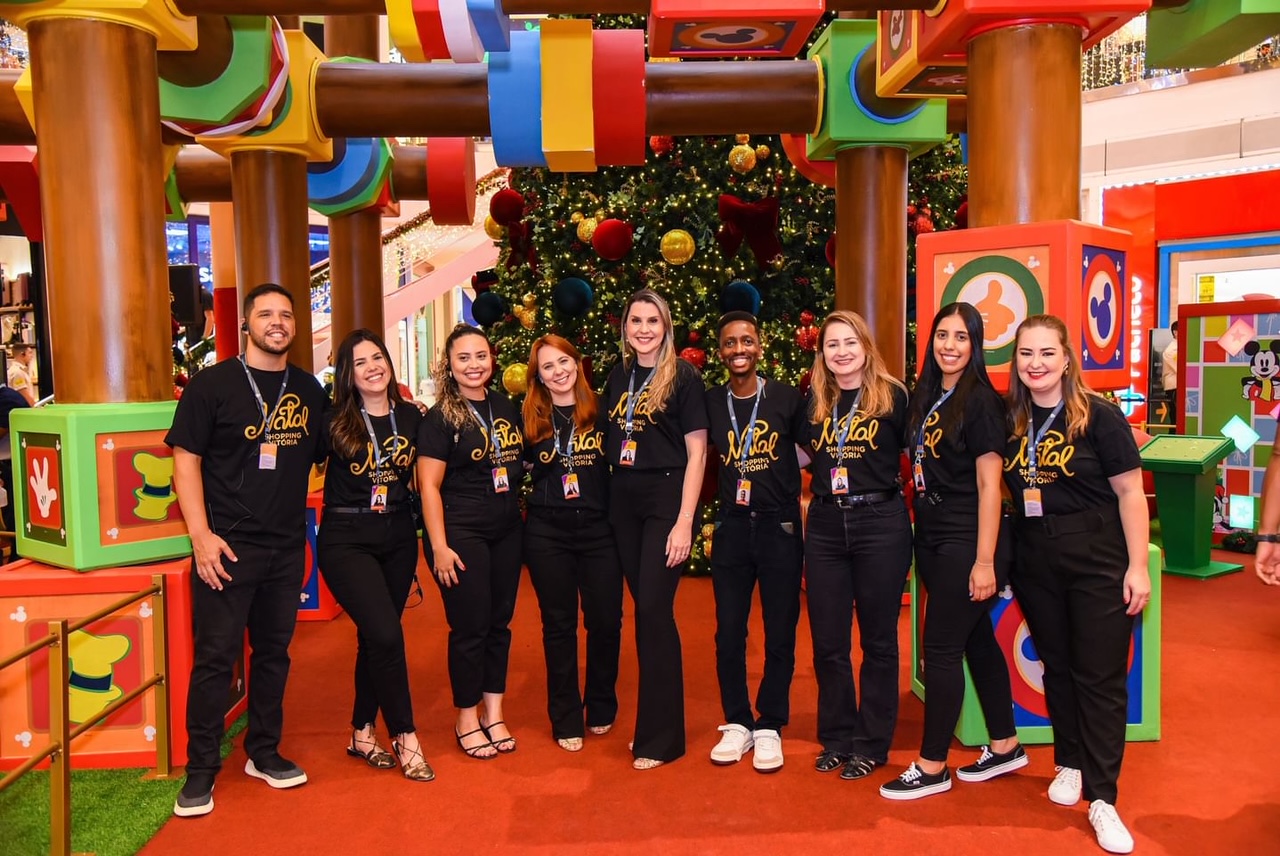 A chegada do Papai Noel no Shopping Vitória, com contagem regressiva ao som da orquestra Alegretto e Tiago Pandim, com apresentação da jornalista Carol Monteiro, foi lindo. O tema Disney e seus amigos deixou decoração encantadora. Até o dia do natal, terão muitas ações especiais que a coluna já contou. Na foto, toda equipe do marketing responsável pelo Natal dos Sonhos: a gerente de marketing Letícia Dalvi e sua equipe.
