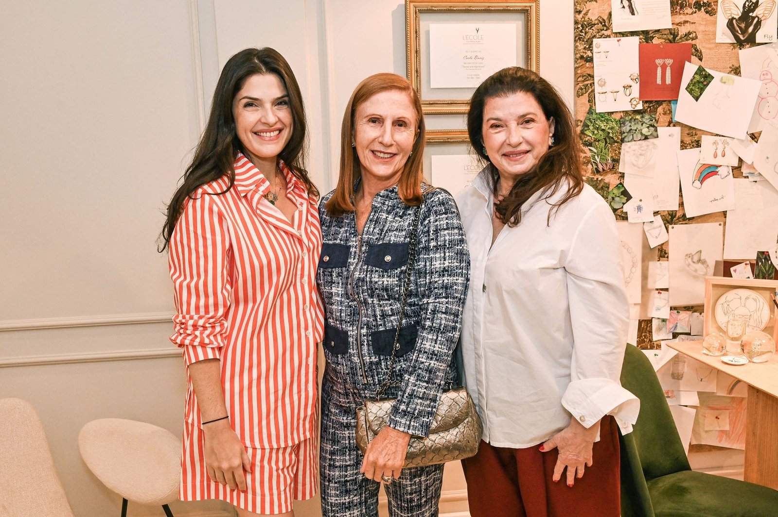 Carla Buaiz, Mary Helal e Vânia Massad Campos no tradicional brunch da designer na Praia do Canto. Foto:Cloves Louzada.