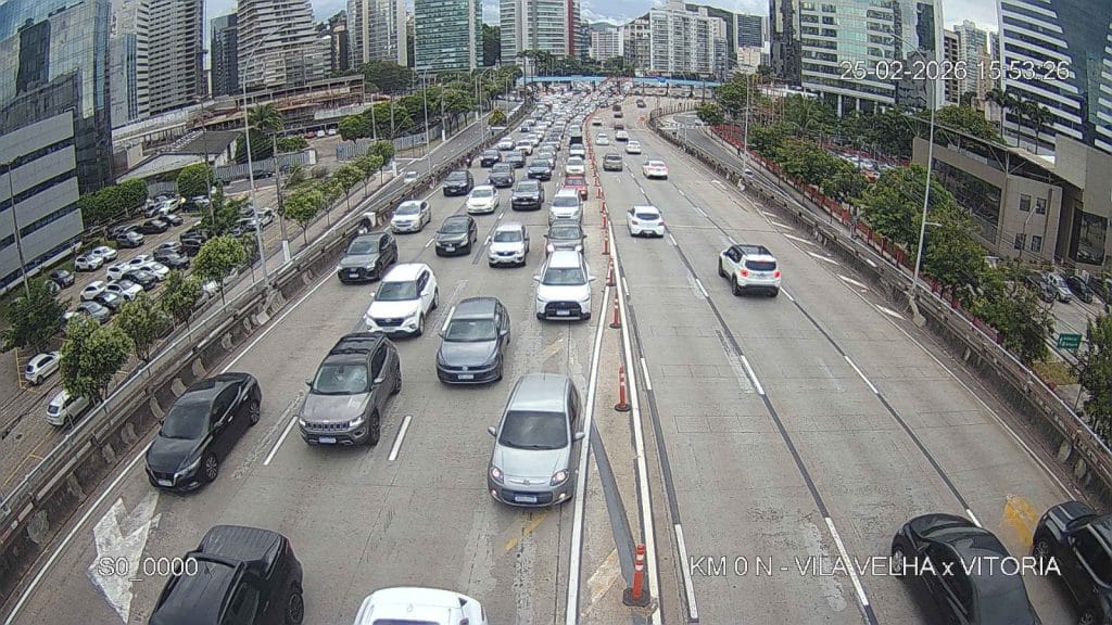 Imagens do videomonitoramento registraram congestionamento intenso no período do acidente, com grande fluxo de veículos na ponte.