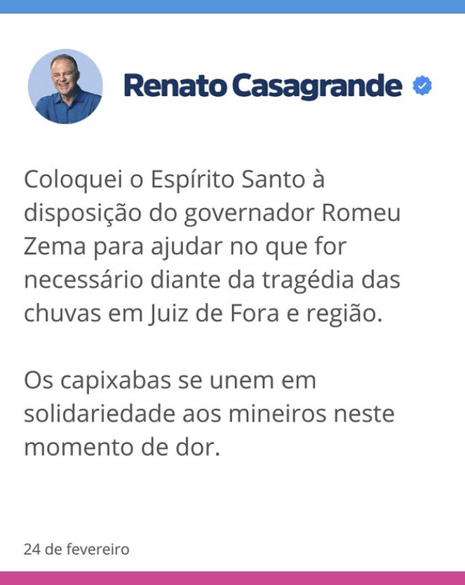 “Os capixabas se unem em solidariedade aos mineiros neste momento de dor”, afirmou Casagrande ao manifestar apoio às cidades atingidas, principalmente na Zona da Mata.