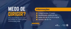 O curso será realizado pela Escola Pública de Trânsito (EPT) entre os dias 5 e 14 de agosto, das 14h às 17h, em formato de Ensino a Distância (EaD) ao vivo. As aulas são acessíveis a todos os interessados, habilitados ou não, que desejam enfrentar seu medo de dirigir ou iniciar o processo de habilitação.