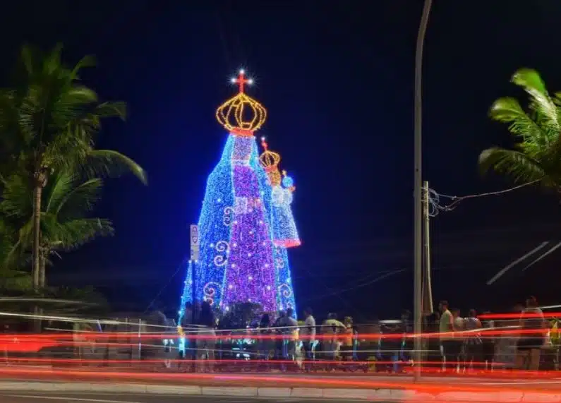 A escultura luminosa, com mais de 18 metros de altura e cerca de 120 mil pontos de luz, foi acesa por volta das 19h, em frente à Avenida Champagnat. O público acompanhou a cerimônia nas areias da praia, em um ambiente de fé e contemplação.