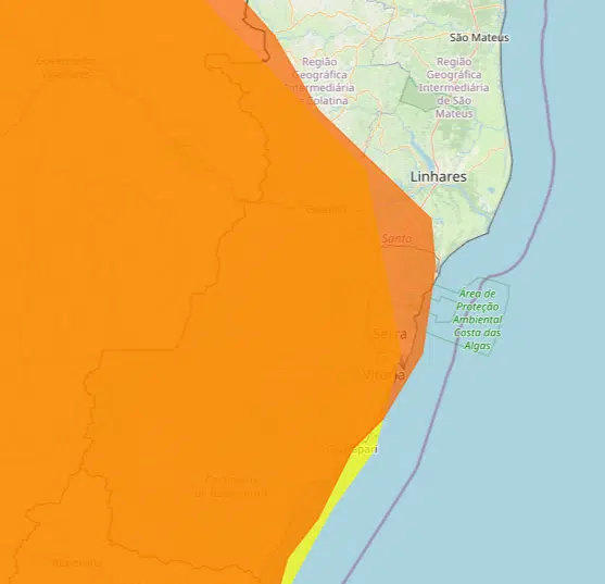 Além do alerta laranja, o Inmet também publicou um alerta amarelo (perigo potencial) para parte do Espírito Santo no mesmo período.