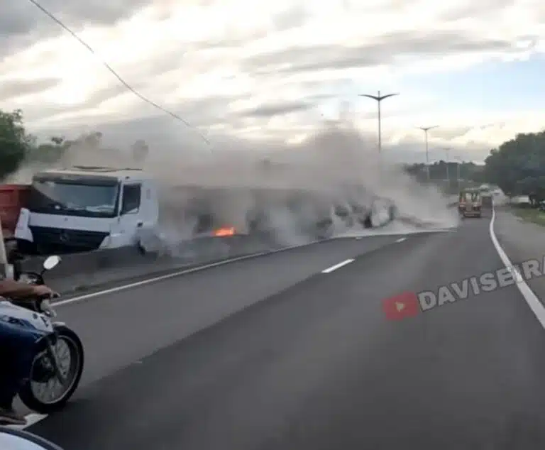 Um motociclista registrou o momento exato de um grave acidente envolvendo duas carretas na Rodovia do Contorno, em Cariacica, na última sexta-feira (24). A colisão chamou atenção pela força do impacto e pelo risco enfrentado por quem passava pelo local no instante da batida.