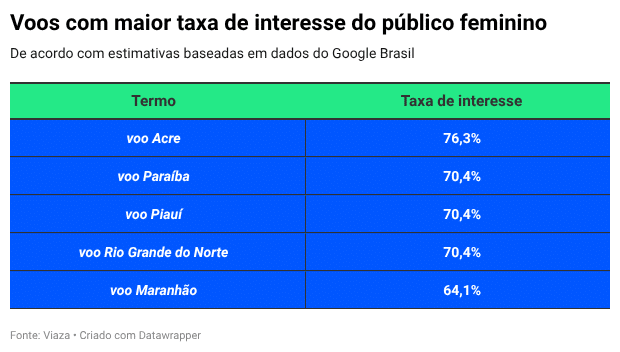 Nesse sentido, uma pesquisa recente apontou quais destinos nacionais são os mais buscados pelos brasileiros no geral e pelas mulheres utilizando o termo “voo (nome do estado)”.