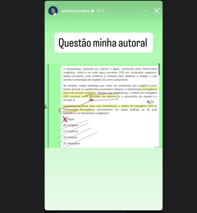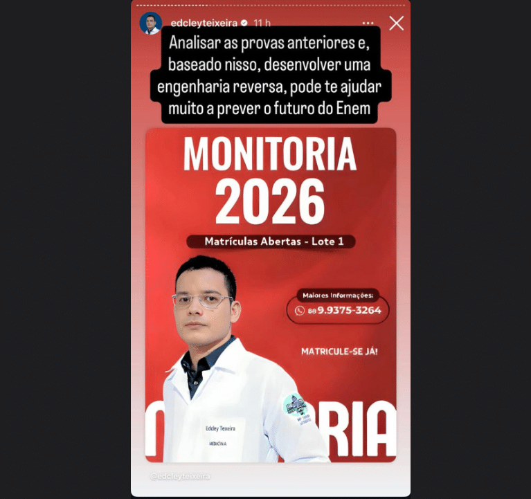 Os materiais de Teixeira, em PDF ou em lives, aos quais o Estadão teve acesso, afirmam que “essas questões estarão no Enem” ou “inéditas conseguidas por Edcley Teixeira”. Em uma live (transmissão) no dia 11 de novembro, ele e um colega, apresentaram e resolveram 90 questões, chamadas de “minhas apostas para o Enem”.