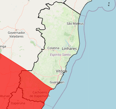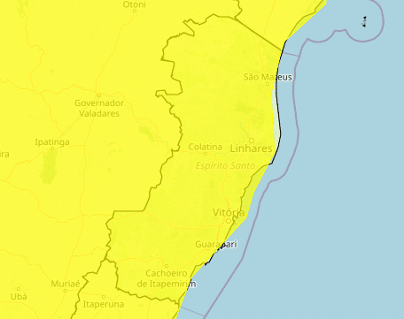O alerta de menor gravidade atinge todos os municípios do Espírito Santo. A previsão é de chuva entre 20 e 30 milímetros por hora, ou até 50 milímetros por dia. Há baixo risco de alagamentos e pequenos deslizamentos.