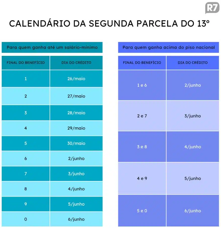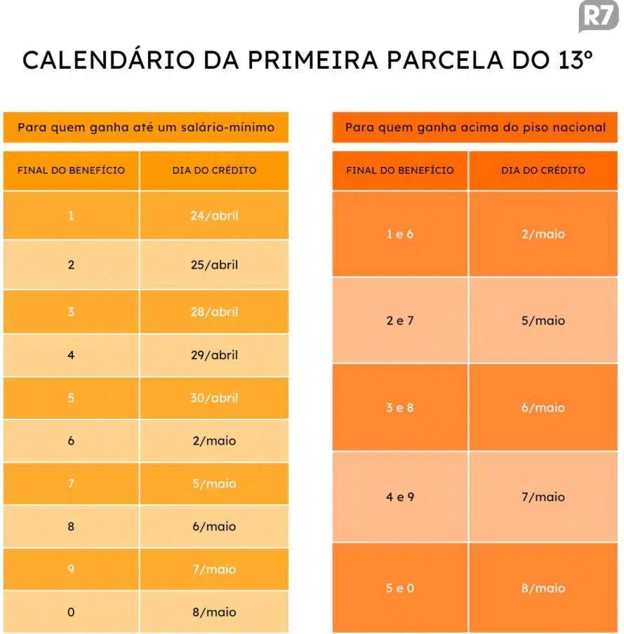 O pagamento de 50% da gratificação natalina virá com o benefício deste mês, que será pago de 24 de abril a 8 de maio. A segunda parcela sairá com o calendário de maio, que vai de 26 de maio a 6 de junho.