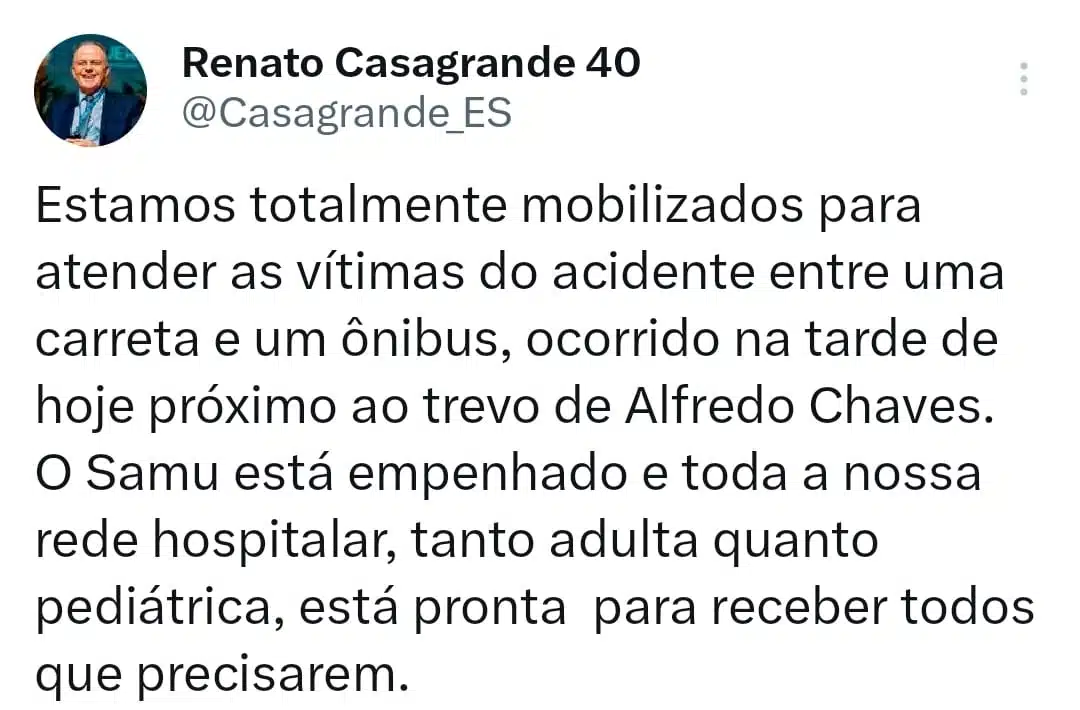 O acidente mobilizou também o governador Renato Casagrande, que se pronunciou nas redes sociais: “Estamos mobilizados para prestar todo o atendimento necessário. O Samu está no local e nossa rede hospitalar, tanto adulta quanto pediátrica, está pronta para receber os feridos.”