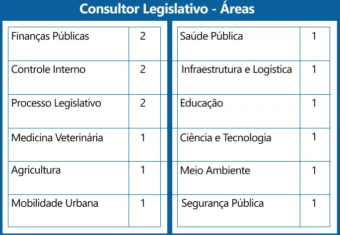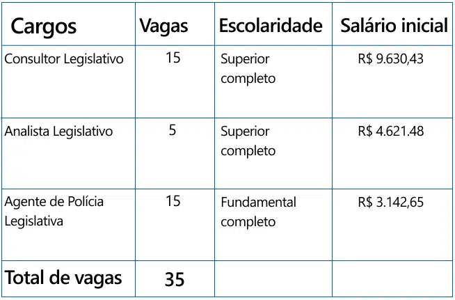 As oportunidades estão distribuídas entre os cargos de Consultor Legislativo (15 vagas), Analista Legislativo (5 vagas) e Policial Legislativo (15 vagas). Segundo o diretor-geral, a expectativa é de que o concurso seja realizado ainda este ano, com nomeações previstas para janeiro ou fevereiro de 2026.