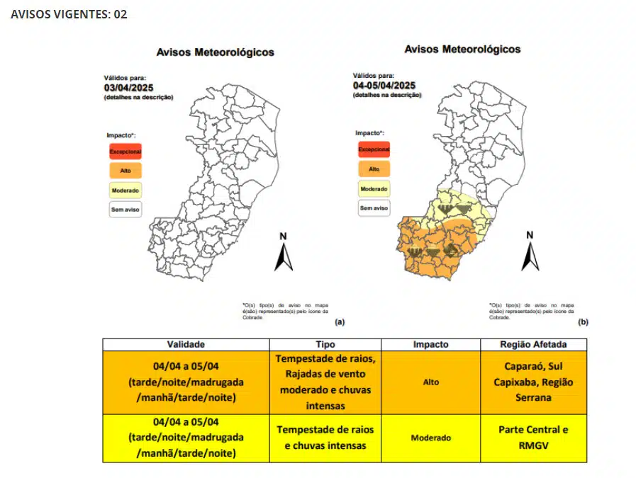 - 04/04 – o dia deverá amanhecer estável e com tempo firme, no entanto, a partir do fim de tarde existe possibilidade de pancadas de chuvas de forte intensidade na metade Sul do Espírito Santo. Tais chuvas poderão registrar acumulados expressivos, assim como, gerar transtornos como enxurradas e alagamentos, sobretudo na extremidade Sul do ES.