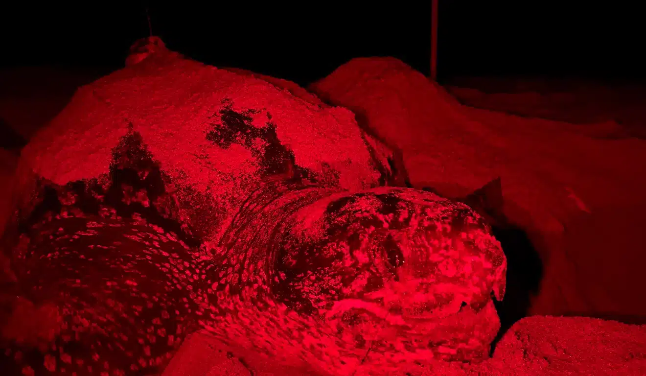 Segundo a bióloga Camila Miguel, do projeto, a luz vermelha é utilizada porque causa menos interferência no comportamento dos animais. As tartarugas são muito sensíveis à luz branca, podendo se assustar e: interromper a postura, escolher um local inadequado para o ninho ou até desistir da desova.