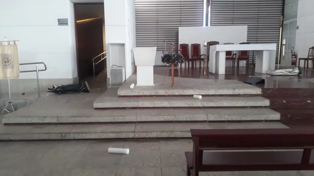 Registros feitos no local mostram imagens destruídas espalhadas pelo chão da igreja e próximas ao altar. Bíblias e velas também foram danificadas.