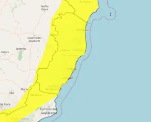 A previsão é de chuva entre 20 e 30 mm/h ou até 50 mm/dia e ventos intensos de até 60 km/h. Há um baixo risco de corte de energia elétrica, estragos em plantações, queda de galhos de árvores e de alagamentos.