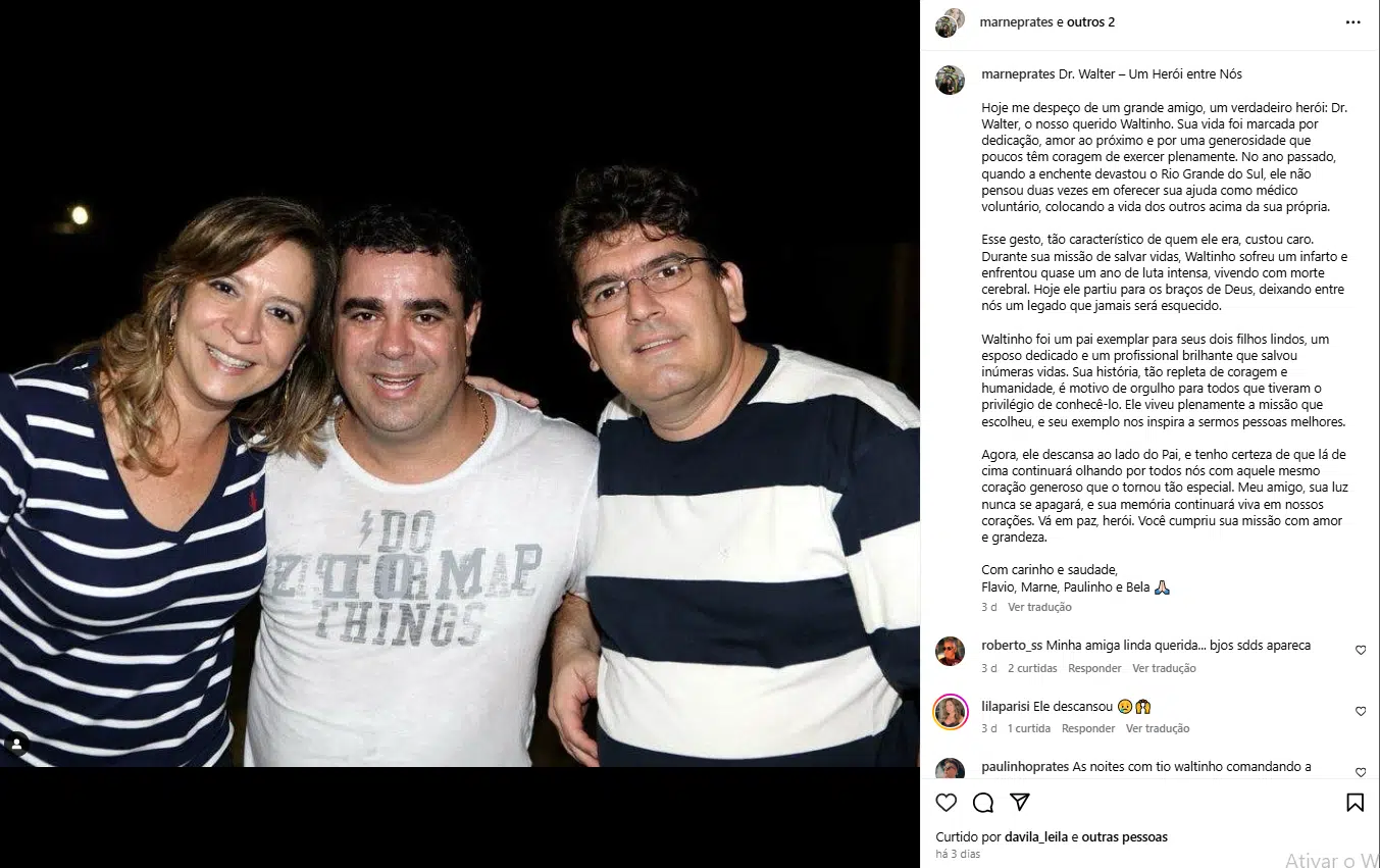 Amigos e parentes lamentaram nas redes a morte do médico voluntário. “Sua vida foi marcada por dedicação, amor ao próximo e por uma generosidade que poucos têm coragem de exercer plenamente. No ano passado, quando a enchente devastou o Rio Grande do Sul, ele não pensou duas vezes em oferecer sua ajuda como médico voluntário, colocando a vida dos outros acima da sua própria”, diz parte de uma nota compartilhada no Instagram.