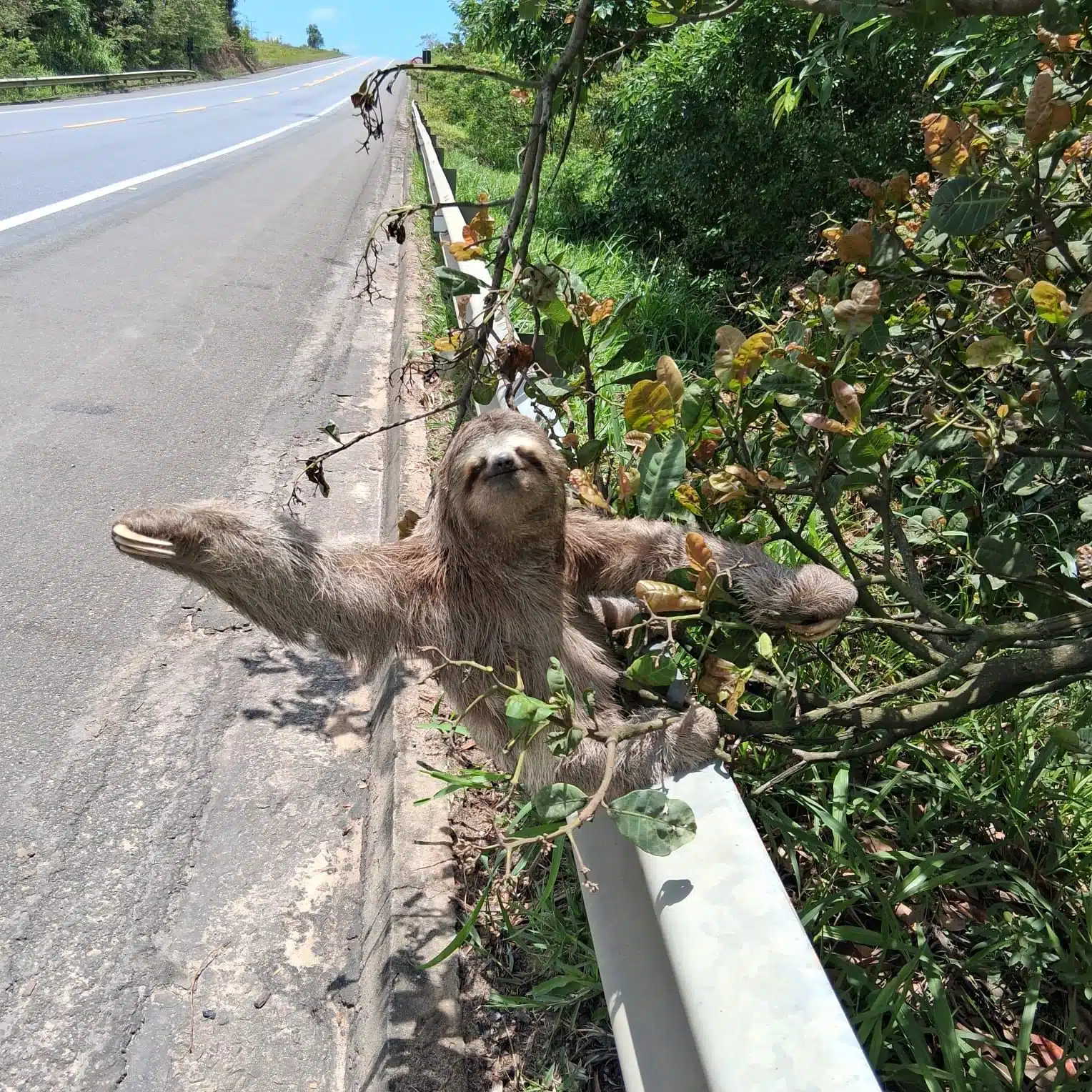 O funcionário Milson dos Santos de Souza, que realiza inspeções cotidianamente na via, interrompeu o trabalho para garantir a travessia segura do animal. Com cuidado e atenção, ele conduziu a preguiça até o outro lado da pista, evitando riscos tanto para o bicho quanto para os motoristas.