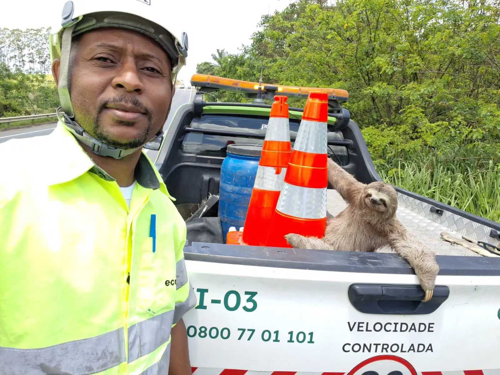 O funcionário Milson dos Santos de Souza, que realiza inspeções cotidianamente na via, interrompeu o trabalho para garantir a travessia segura do animal. Com cuidado e atenção, ele conduziu a preguiça até o outro lado da pista, evitando riscos tanto para o bicho quanto para os motoristas.