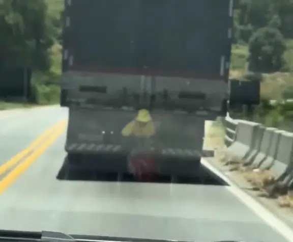 Segundo a Eco 101, concessionária que administra a via, a equipe da Praça de Pedágio avisou o Centro de Controle Operacional sobre o flagrante do homem na traseira do caminhão.