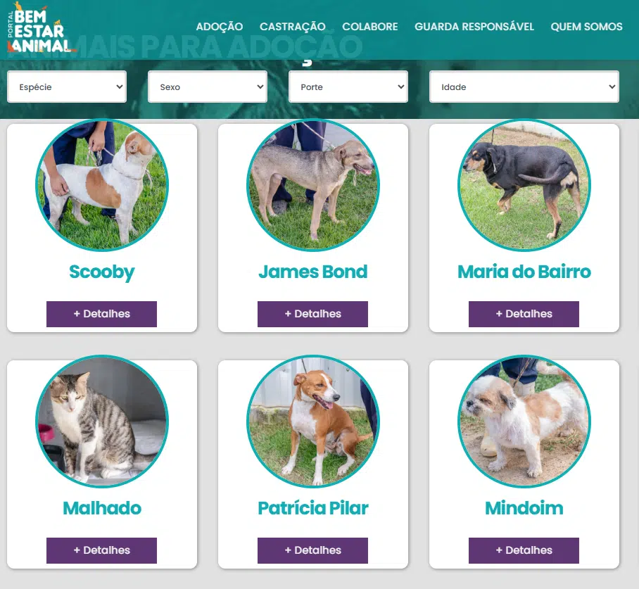 Os pets disponíveis para adoção têm nomes criativos e bem-humorados, como “James Bond” e “Maria do Bairro”. O cadastro de cada animal inclui fotos, idade, peso, porte, informações sobre vacinação e detalhes sobre castração.